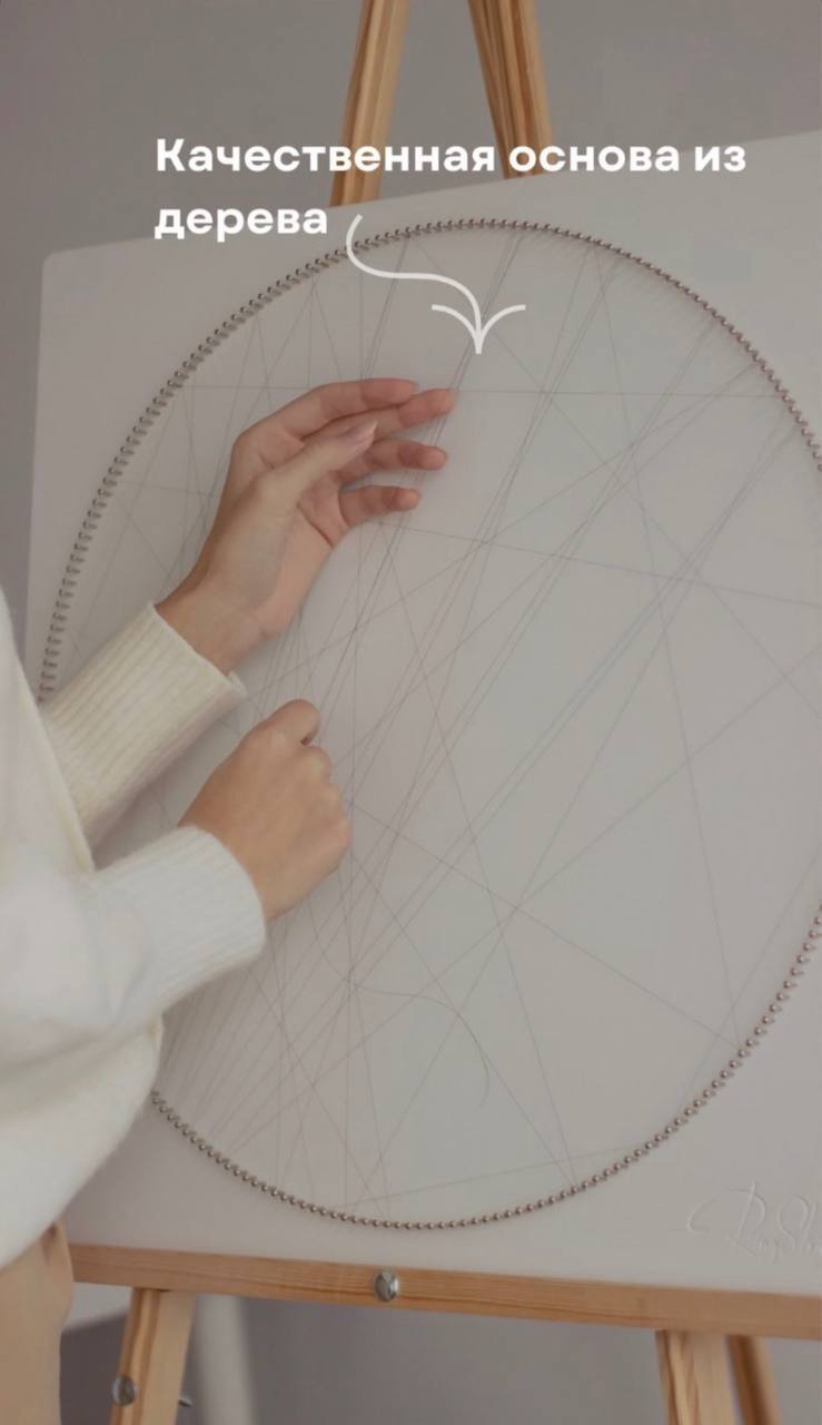 В наборе будут идти: Заготовка с набитыми уже гвоздиками, инструкция по сборке картины, нитки.